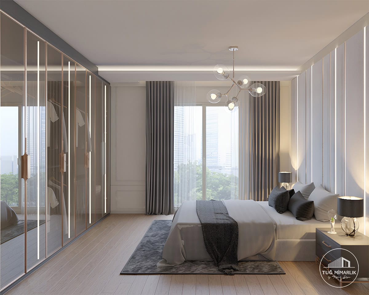 Akasya Koru Yatak Odası projesinde bronz cam giyinme dolapları, tavana uzanan kumaş başlık panelleri ve çıtalı duvar detayları modern bir sakinlik oluşturdu.