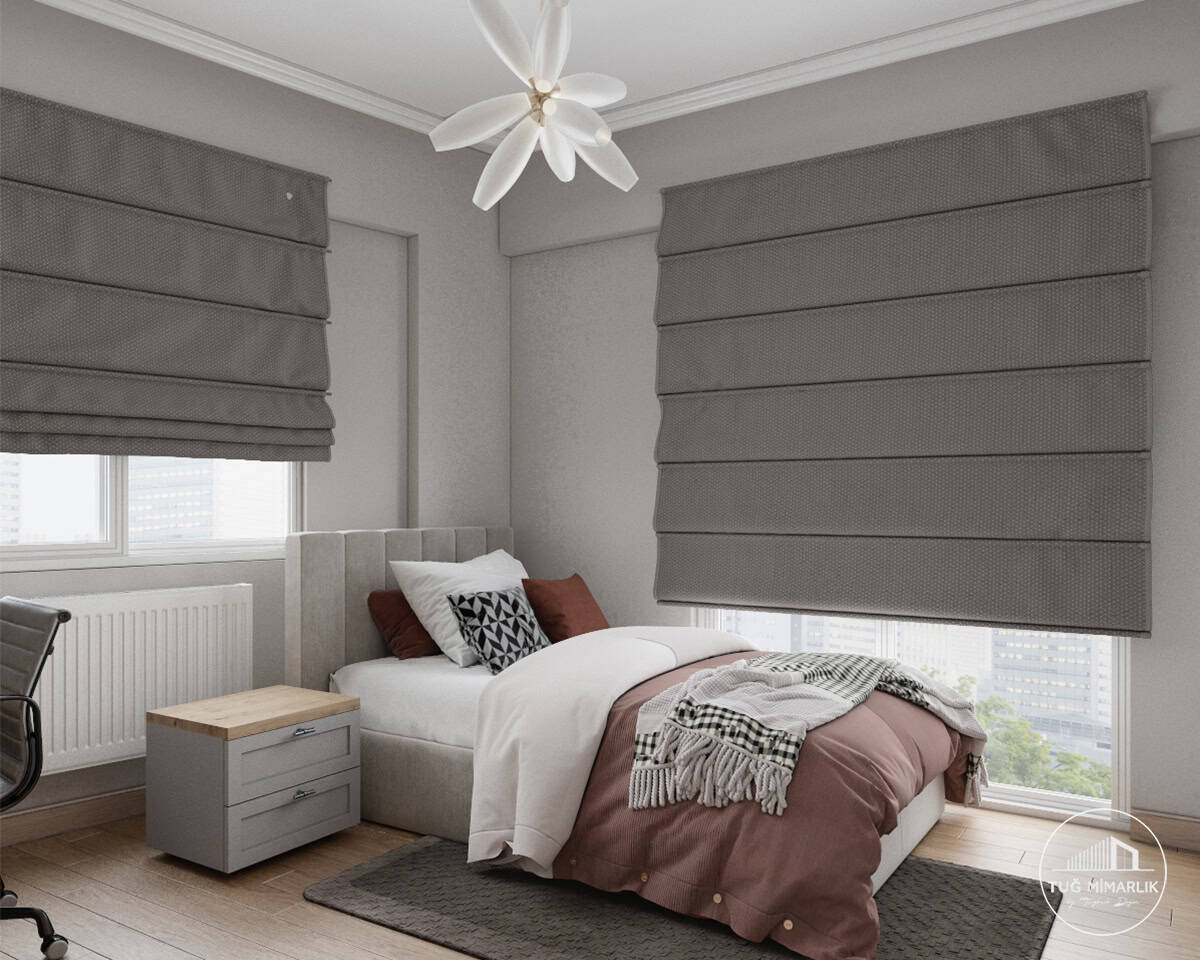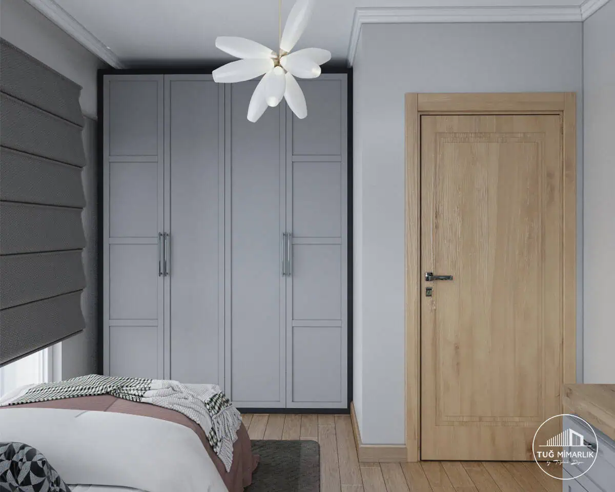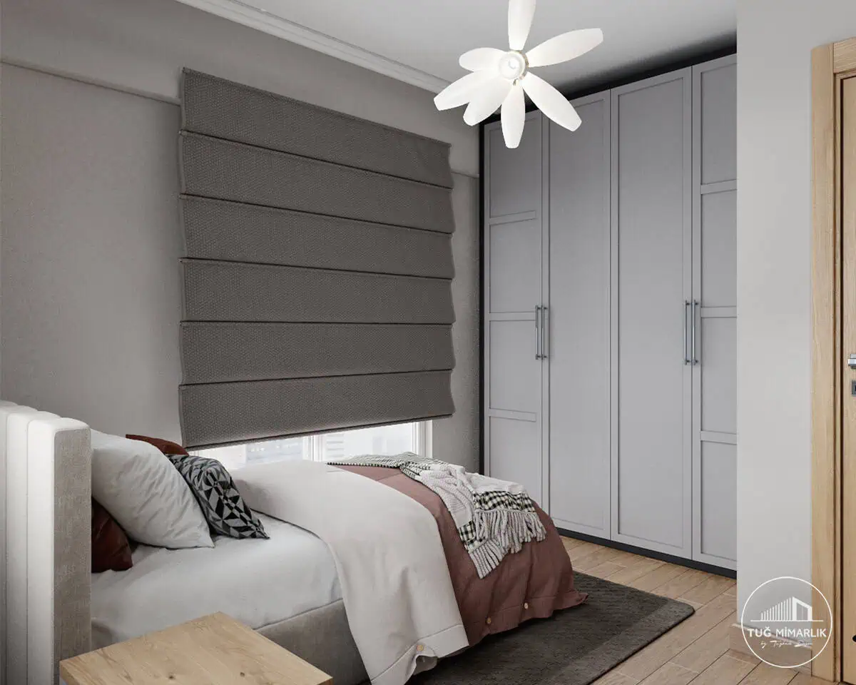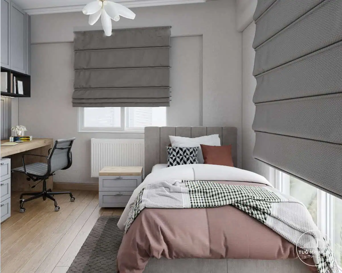Bu projede tek kişilik yatak yerleşimi, odanın hem dinlenme hem çalışma ihtiyacını aynı anda karşılayacak biçimde ele alındı. Yatağın pencere tarafına yakın konumlandırılması, odanın merkezini boş bırakırken hareket alanını da koruyor. Başucunda konumlandırılan komodin ise günlük kullanım için yeterli depolama sunuyor ve yatağın çevresinde gereksiz kalabalık oluşturmuyor. Yatak başlığındaki döşemeli yüzey, genç odasında daha yumuşak ve daha nitelikli bir görünüm sağlarken gri, açık kahve ve kırık beyaz tonları sayesinde oda yaş olarak daha uzun süre kullanılabilecek bir çizgide kalıyor. Bu da projeyi kısa süreli bir çocuk odası çözümünden ayırıyor. Özellikle 10 m² civarındaki odalarda en büyük hata, yatağı ve çalışma alanını birbirine sıkıştırmaktır. Burada ise yerleşim kararları daha sakin ve kontrollü ilerlediği için mekân rahat nefes alıyor. Bu nedenle proje; tek kişilik genç odası tasarımı, küçük genç odası tasarımı ve düzenli yaşam alanı arayan kullanıcılar için güçlü bir referans niteliği taşır. İç mimari sürecimizin kapsamını görmek için hizmetler sayfasına göz atabilirsiniz.