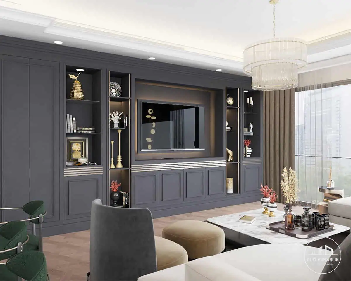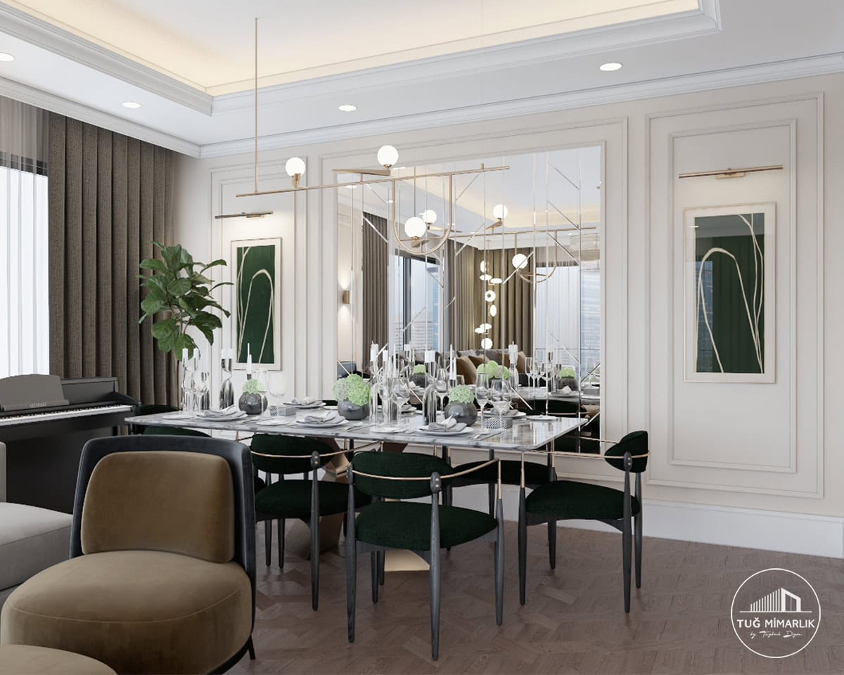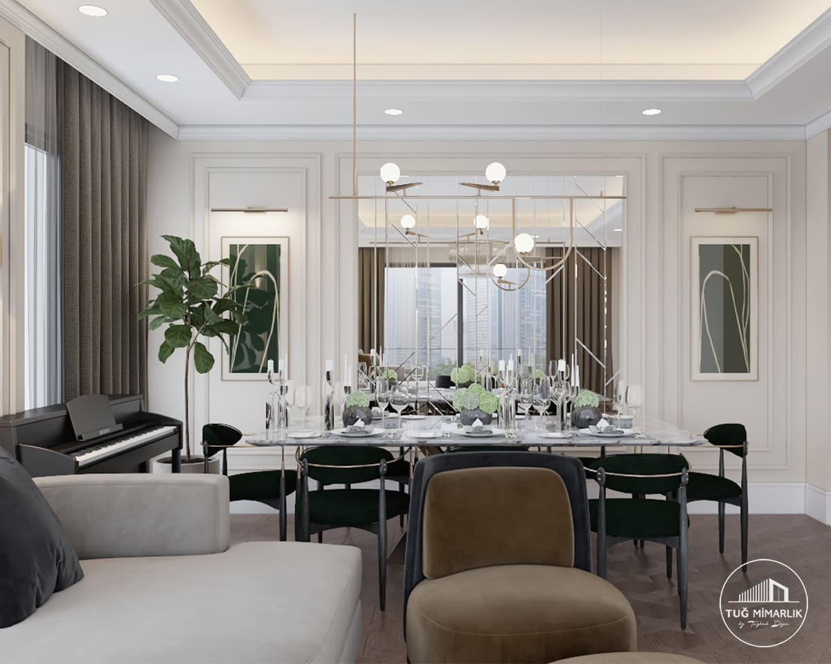 Bu projede salon–yemek alanı bir arada ele alındığı için, kararlar yerleşim ve aydınlatma üzerinden netleşti. Tasarım–imalat–uygulama akışı tek elde yönetildiği için sonuç daha kontrollü ve prestijli ilerledi.