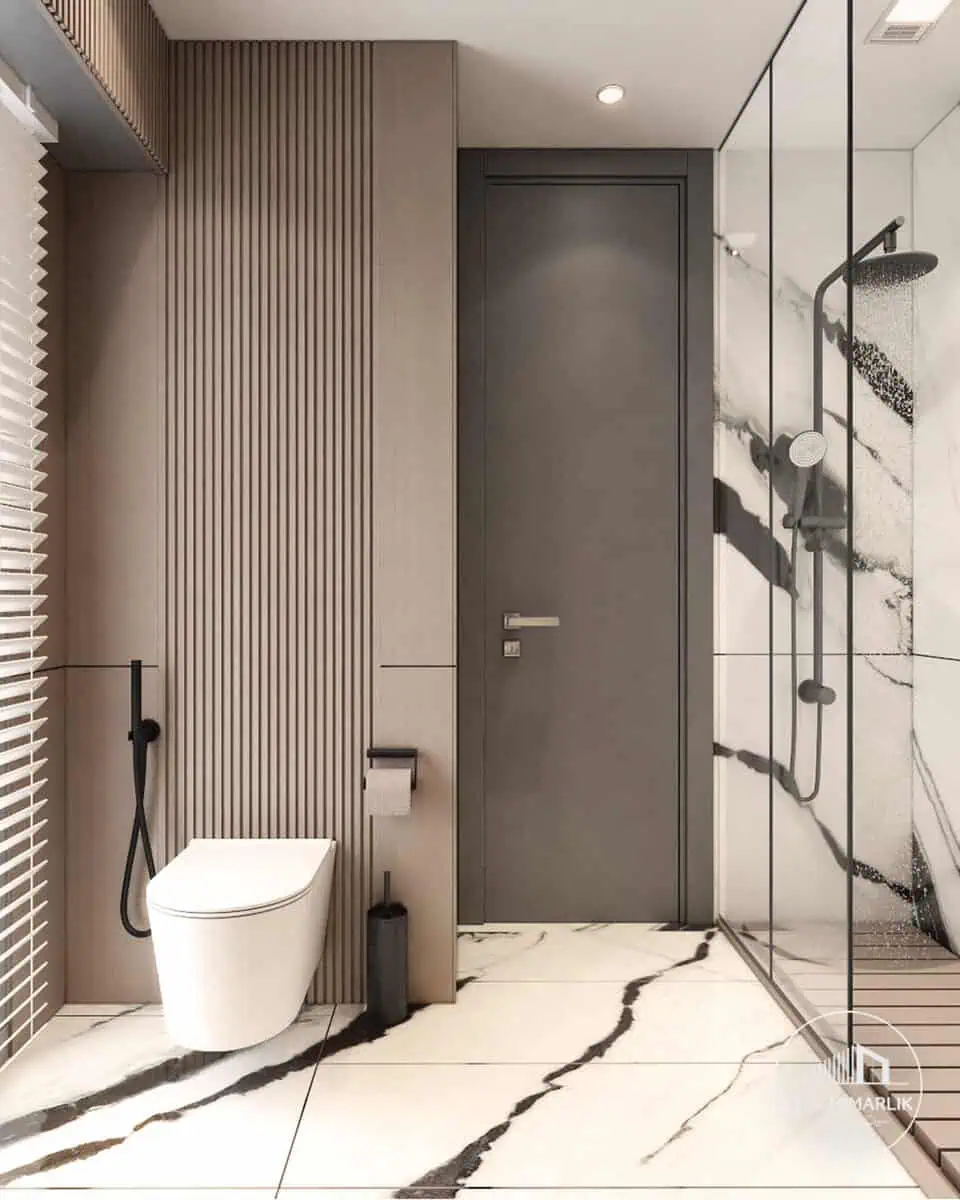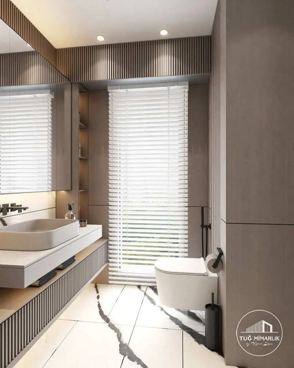 Mekânın karakterini belirleyen ana unsur, lavabo duvarında ve klozet arkasında devam eden fluted (dikey çizgili) panel dokusudur. Bu yüzey, klasik düz panel yerine tercih edilerek hem mimari derinlik sağlıyor hem de banyonun “tek parça” gibi algılanmasına yardımcı oluyor. Dikey çizgiler, tavan yüksekliğini daha uzun gösterirken; panelin sıcak tonu, seramiğin güçlü damar desenini dengeleyip sakin bir görüntü kuruyor. Fluted panel ile Calacatta etkili büyük ebat seramiklerin yan yana gelişi, modern ama zamansız bir dil yakalıyor. Bu yaklaşım özellikle ebeveyn banyolarında prestij algısını yükseltir; çünkü kullanıcı her gün temas ettiği yüzeylerde “kalite” hissini doğrudan yaşar. Projenin tüm konut içi tasarım çizgisini görmek için Projeler sayfasından diğer alanlara da geçebilirsiniz. Tasarım kararlarının nedenlerini konuşmak isterseniz İletişim üzerinden hızlıca randevu talep edebilirsiniz.