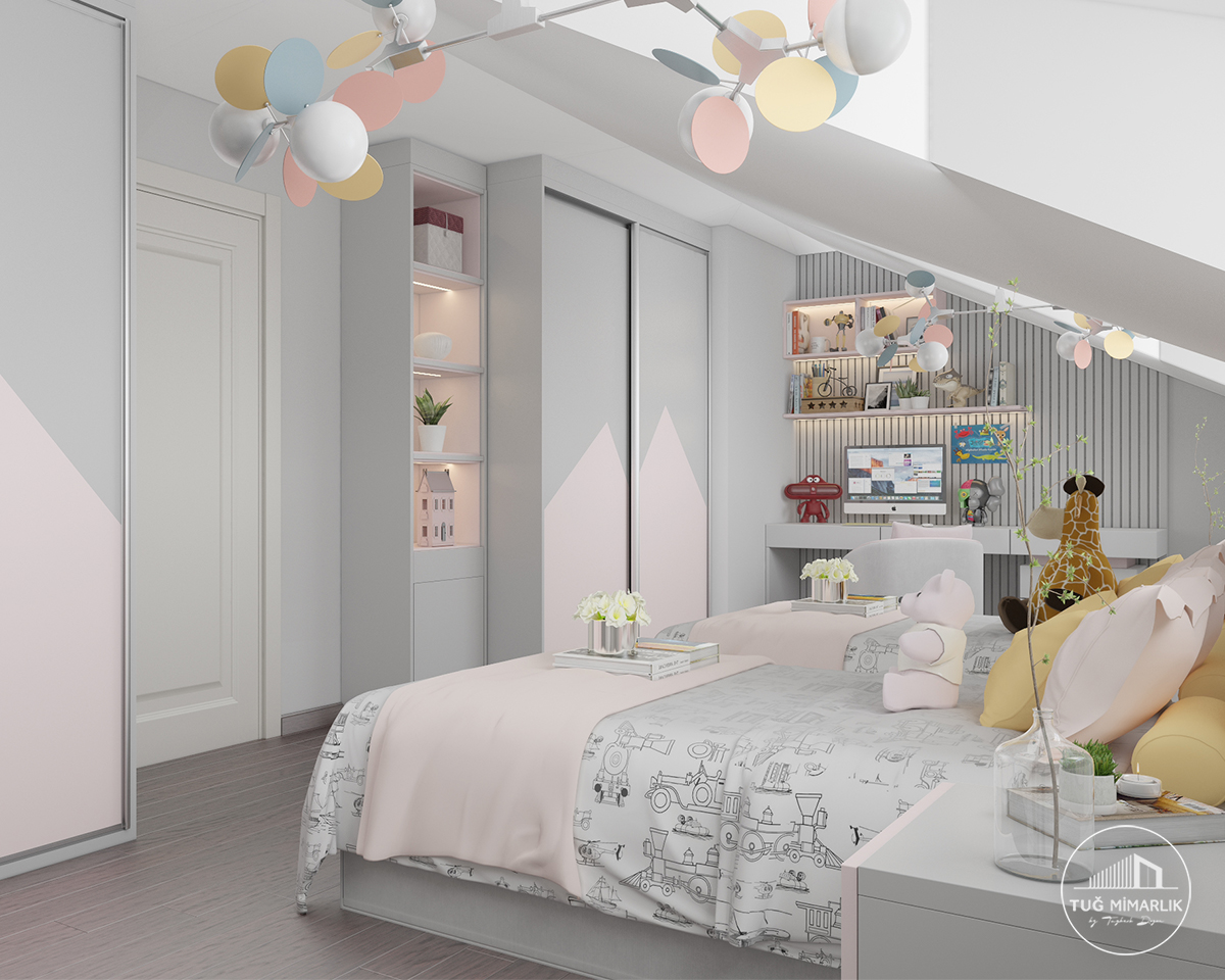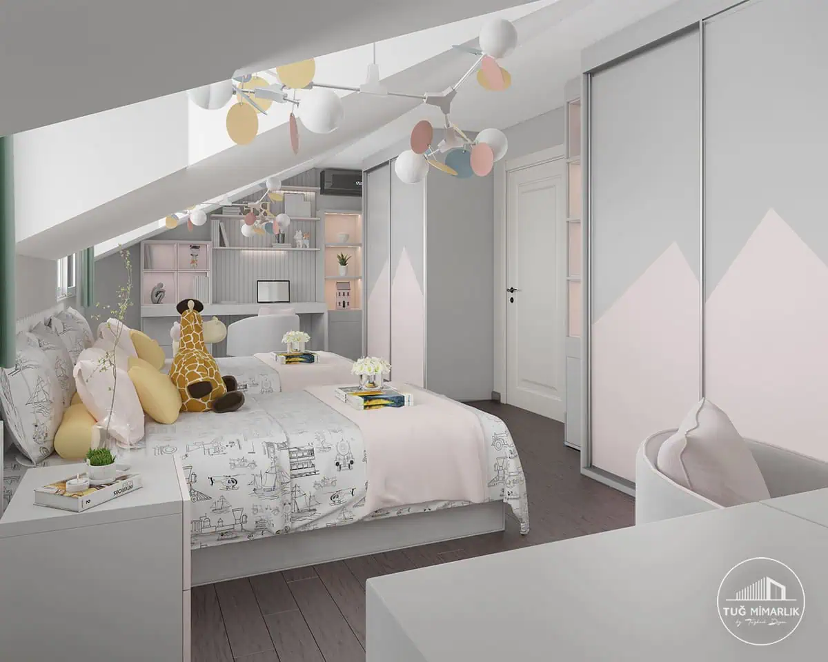 Bu projede Florya İkiz Genç Odası, iki kullanıcının aynı odada rahat etmesini sağlayacak ölçü, depolama ve yerleşim kararlarıyla planlandı. Pastel tonlar, özel dolaplar ve çalışma bölümüyle oda daha düzenli ve daha şık hale getirildi.