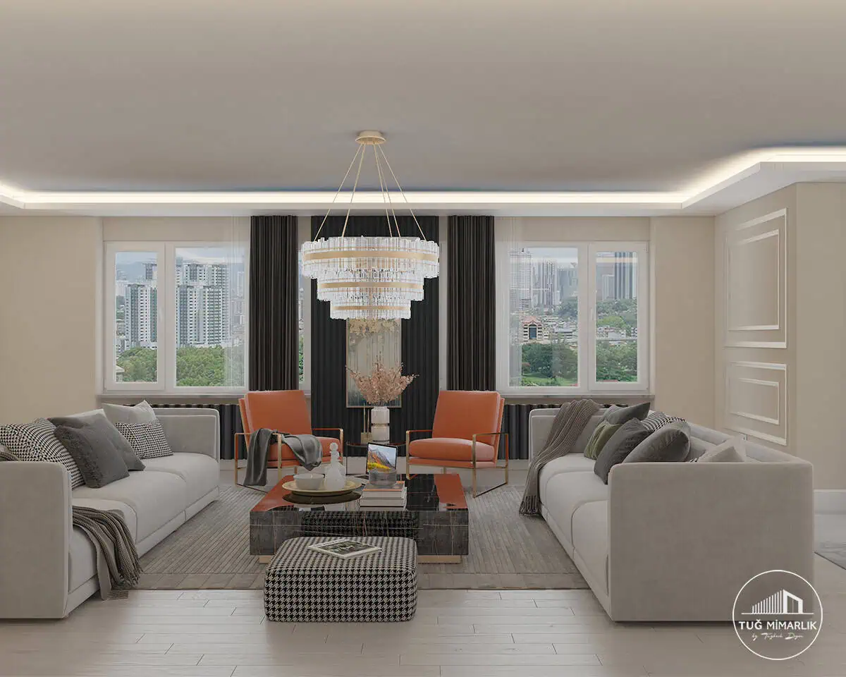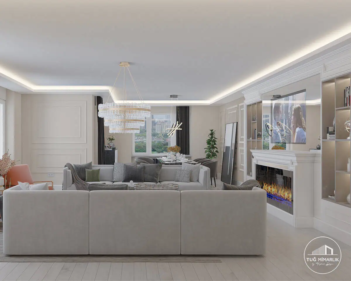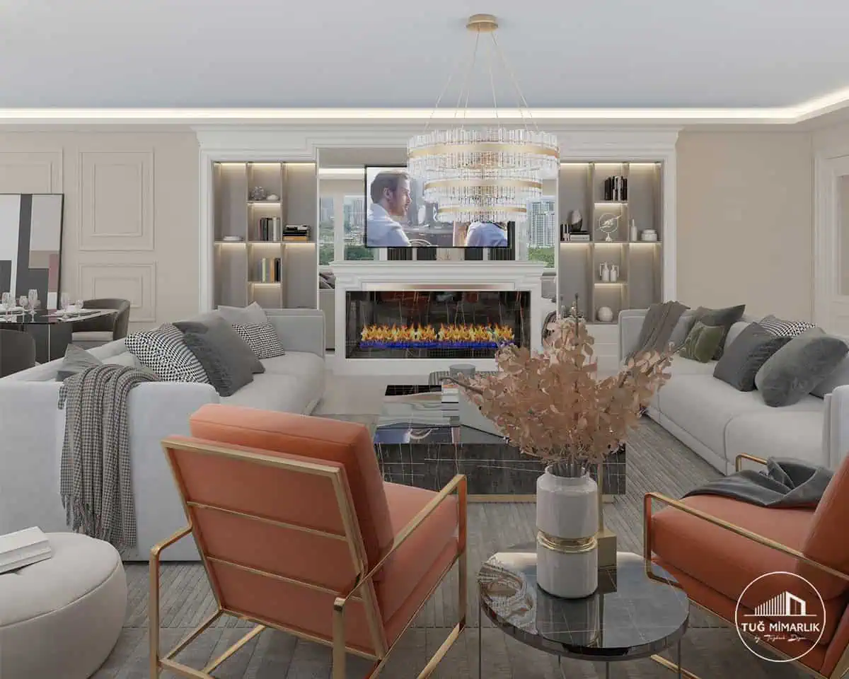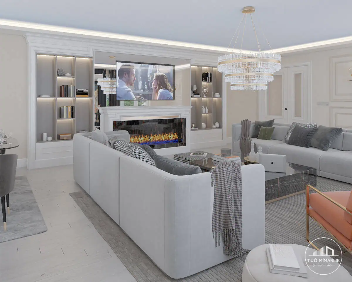 Bu Florya Salon Tasarımı projesinde şömine duvarı, kristal avize ve büyük oturma yerleşimi bir araya getirilerek seçkin bir salon görünümü oluşturuldu.