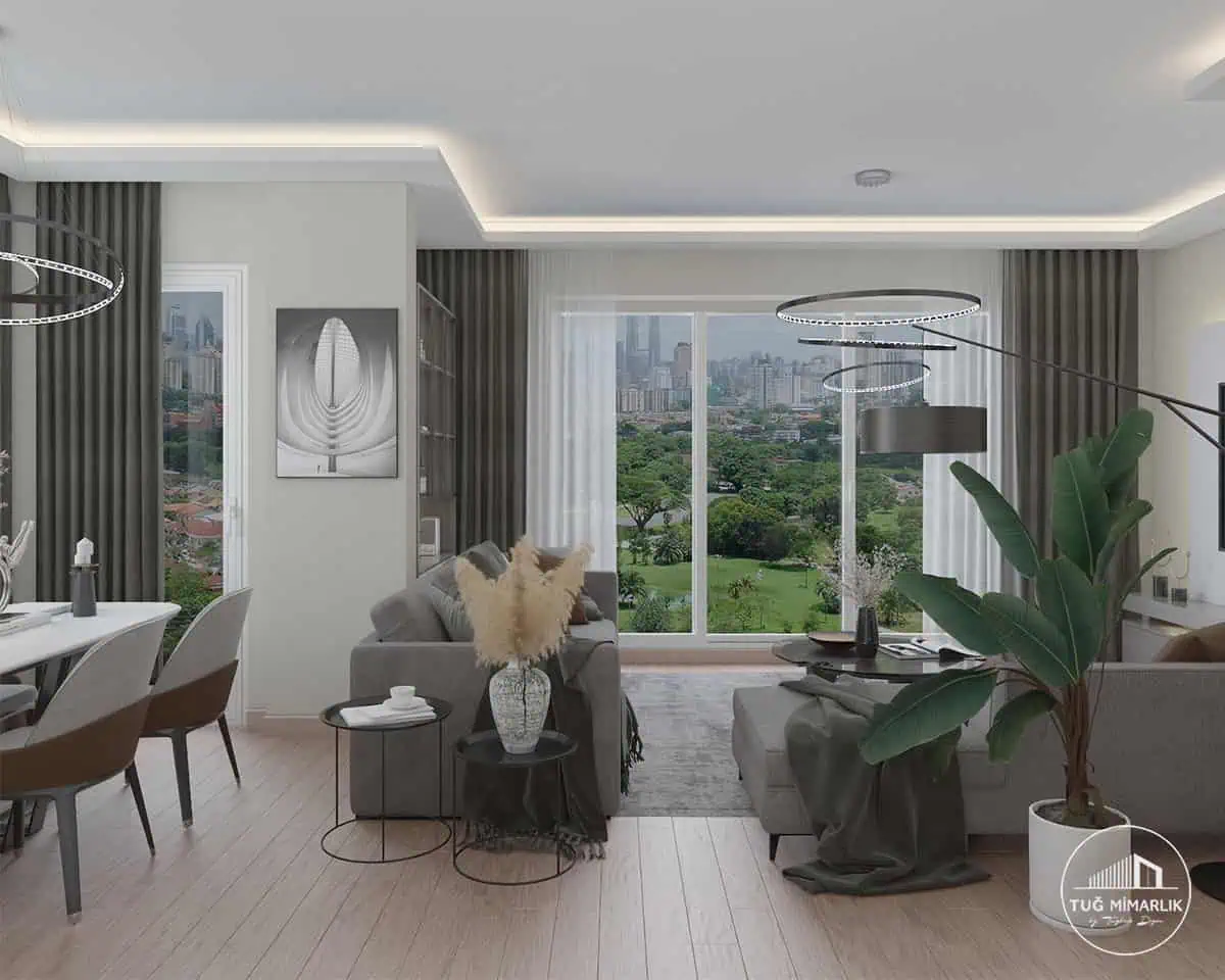 Bu projede Göztepe Salon Tasarımı, gün ışığını güçlü biçimde alan pencere yüzeyleri, açık plan yerleşim ve modern aydınlatma kararlarıyla daha seçkin bir yaşam alanına dönüştürüldü. Oturma bölümü ile yemek alanı aynı dil içinde çözüldü.