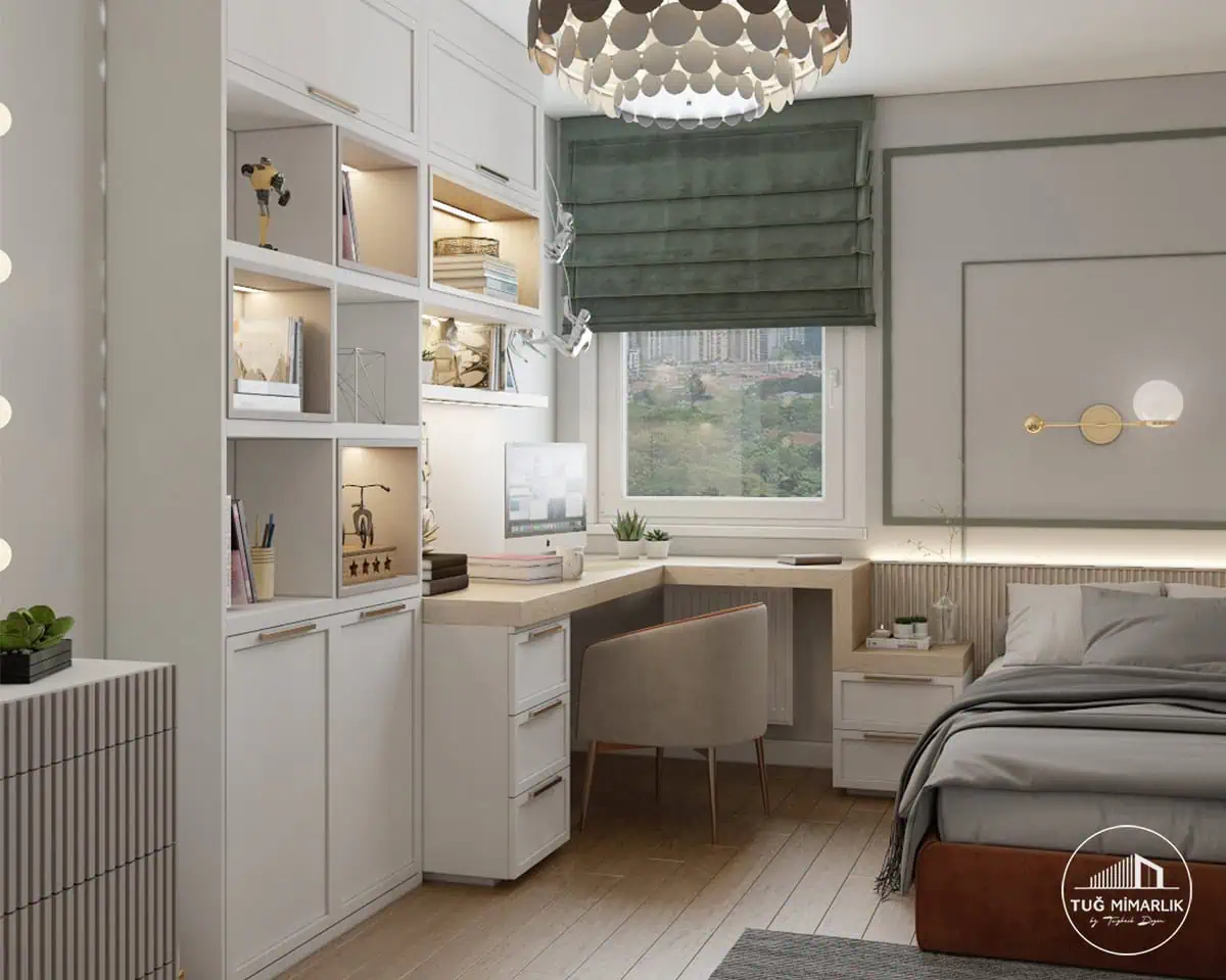 Kadıköy genç odası tasarımı projesinde Baytur Bostancı için; yatak, çalışma masası ve depolamayı tek çizgide topladık. Benzer çözümler için Genç Odası Projeleri sayfasına göz atın.