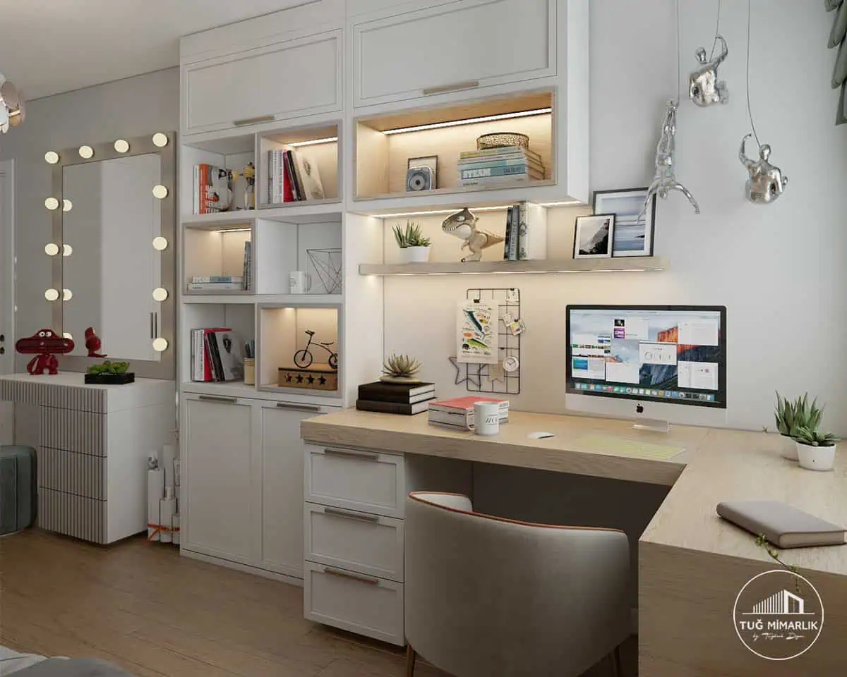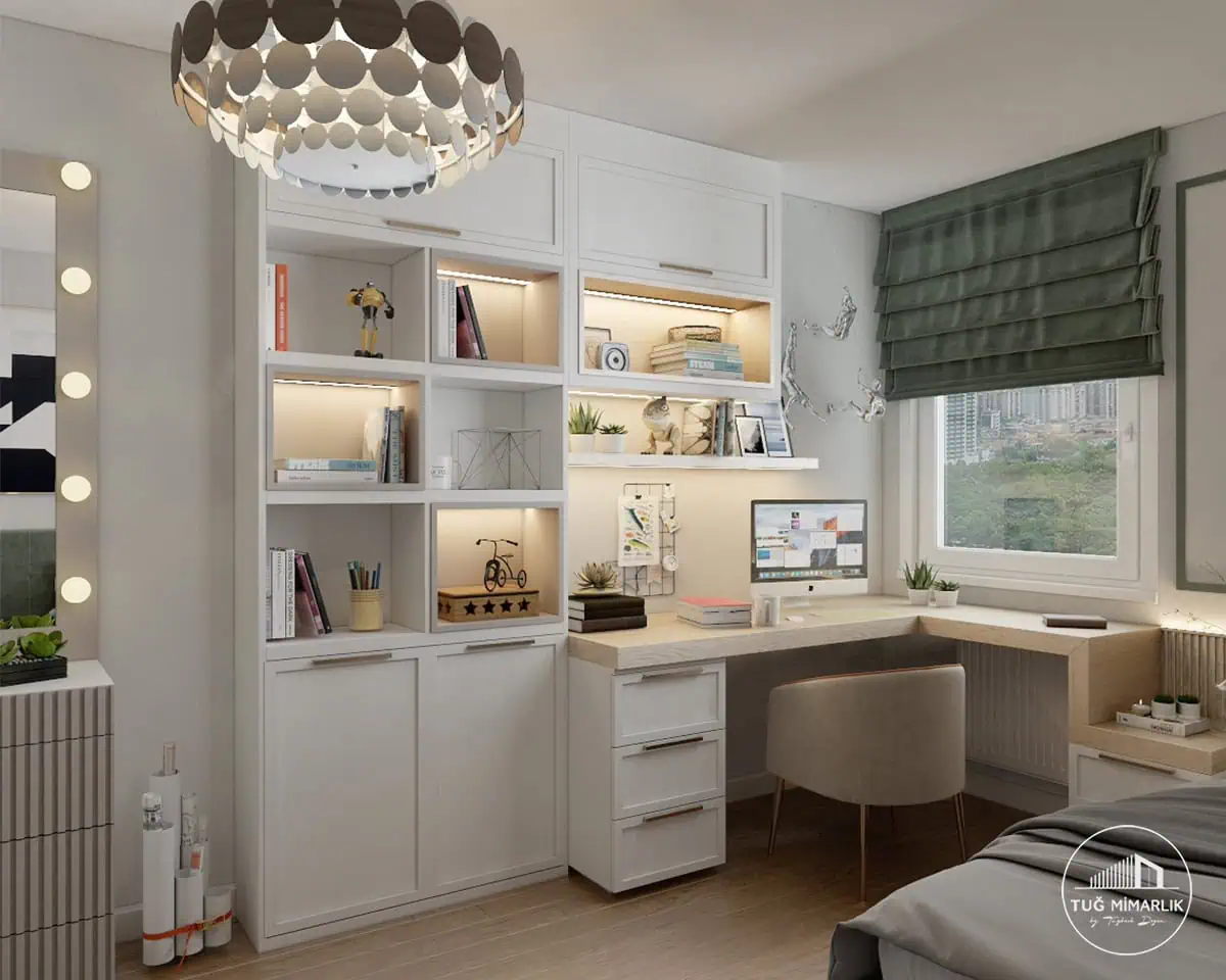 Depolama, “dolap büyük olsun” yaklaşımıyla değil; kullanım senaryosu ile çözülür. Çekmece + kapaklı alan dengesi kurarak günlük düzeni kolaylaştırıyoruz. Örnek çözümler için Genç Odası Projeleri sayfasına bakabilirsiniz.