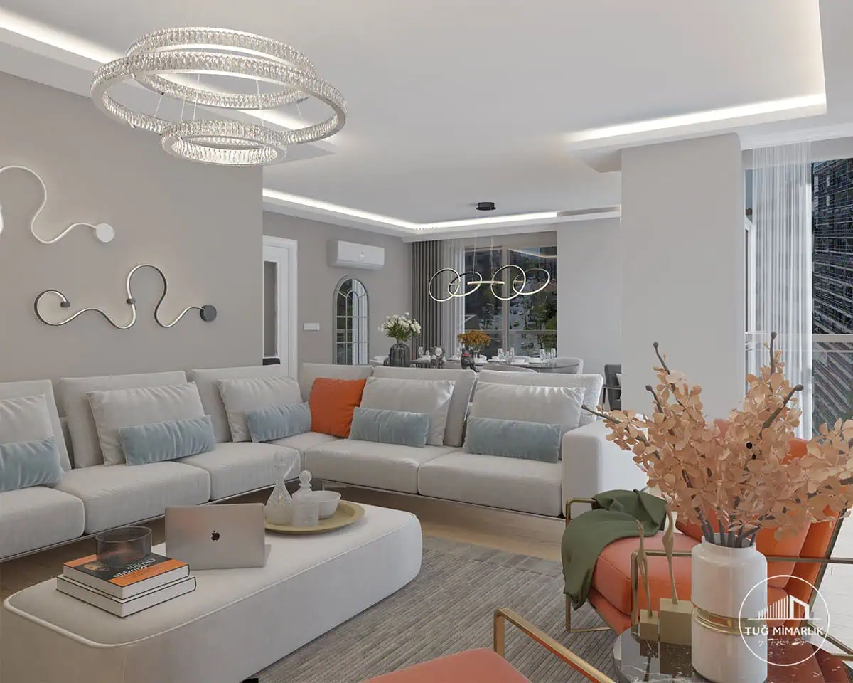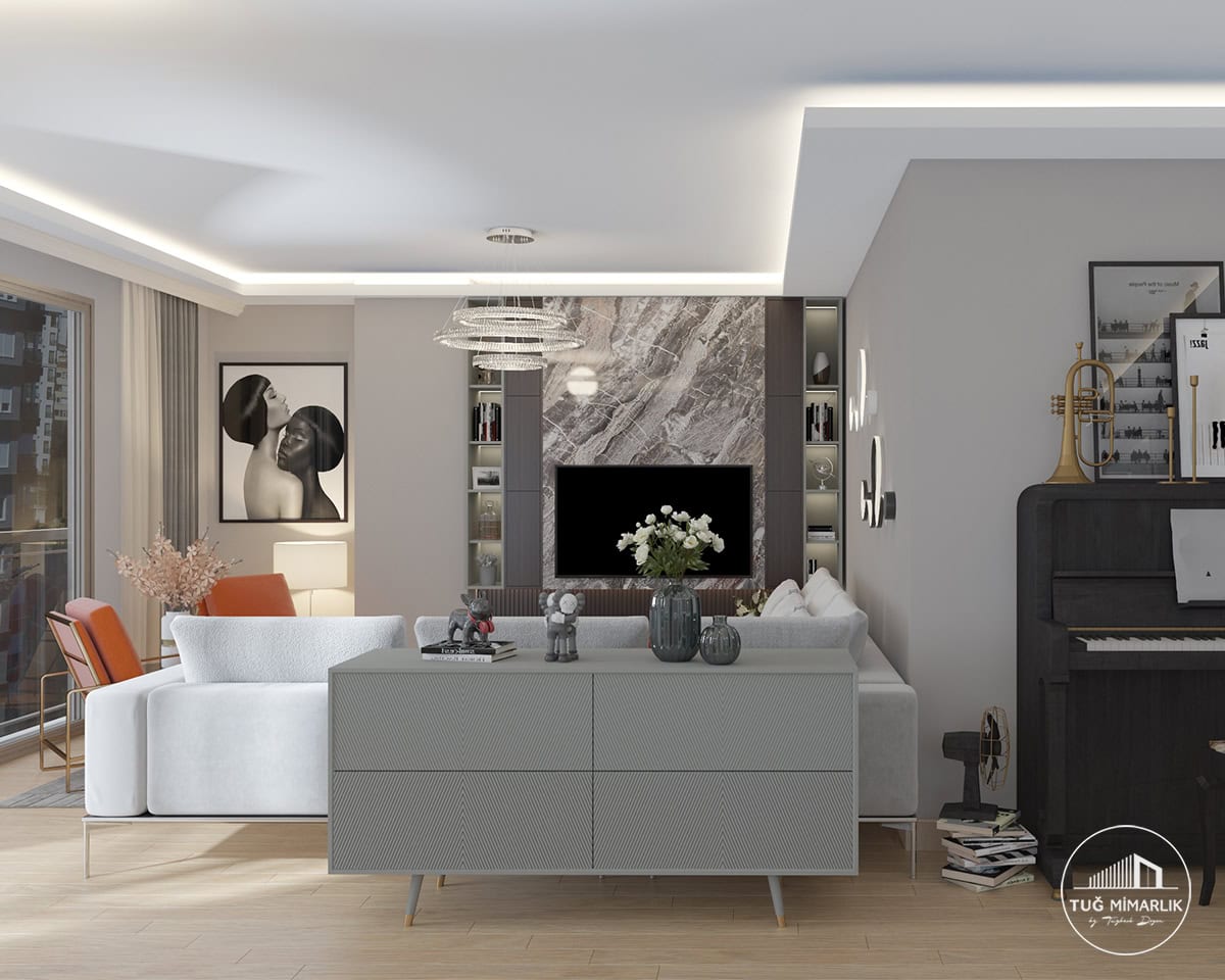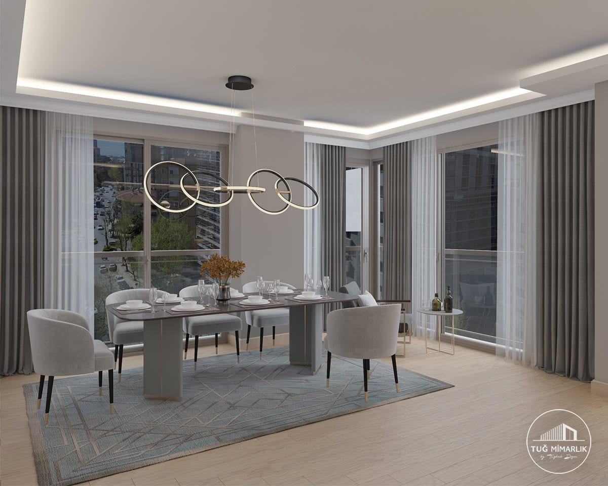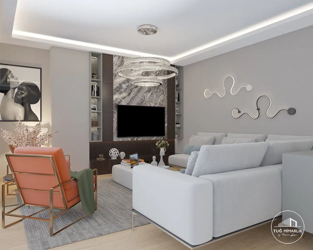 Kadıköy Kalamış’ta bulunan bu konut için hazırlanan Kalamış Modern Salon Tasarımı, geniş oturma alanı ve estetik duvar paneli ile modern bir yaşam alanı oluşturmayı hedefledi. Mekânda kullanılan mermer TV duvarı, dekoratif aydınlatma ve açık tonlu koltuklar sayesinde salon hem şık hem de davetkar bir atmosfere sahip oldu. Salonun yerleşim planı hazırlanırken günlük kullanım alışkanlıkları, misafir ağırlama ihtiyacı ve ferah bir dolaşım alanı birlikte değerlendirildi. Bu yaklaşım sayesinde alan yalnızca bir oturma bölümü değil, aynı zamanda evin en aktif kullanılan yaşam alanı haline geldi. Benzer iç mekân çalışmaları için salon projeleri sayfası incelenebilir. Projede özellikle modern salon dekorasyonu ve TV ünitesi tasarımı gibi detaylar öne çıkıyor.