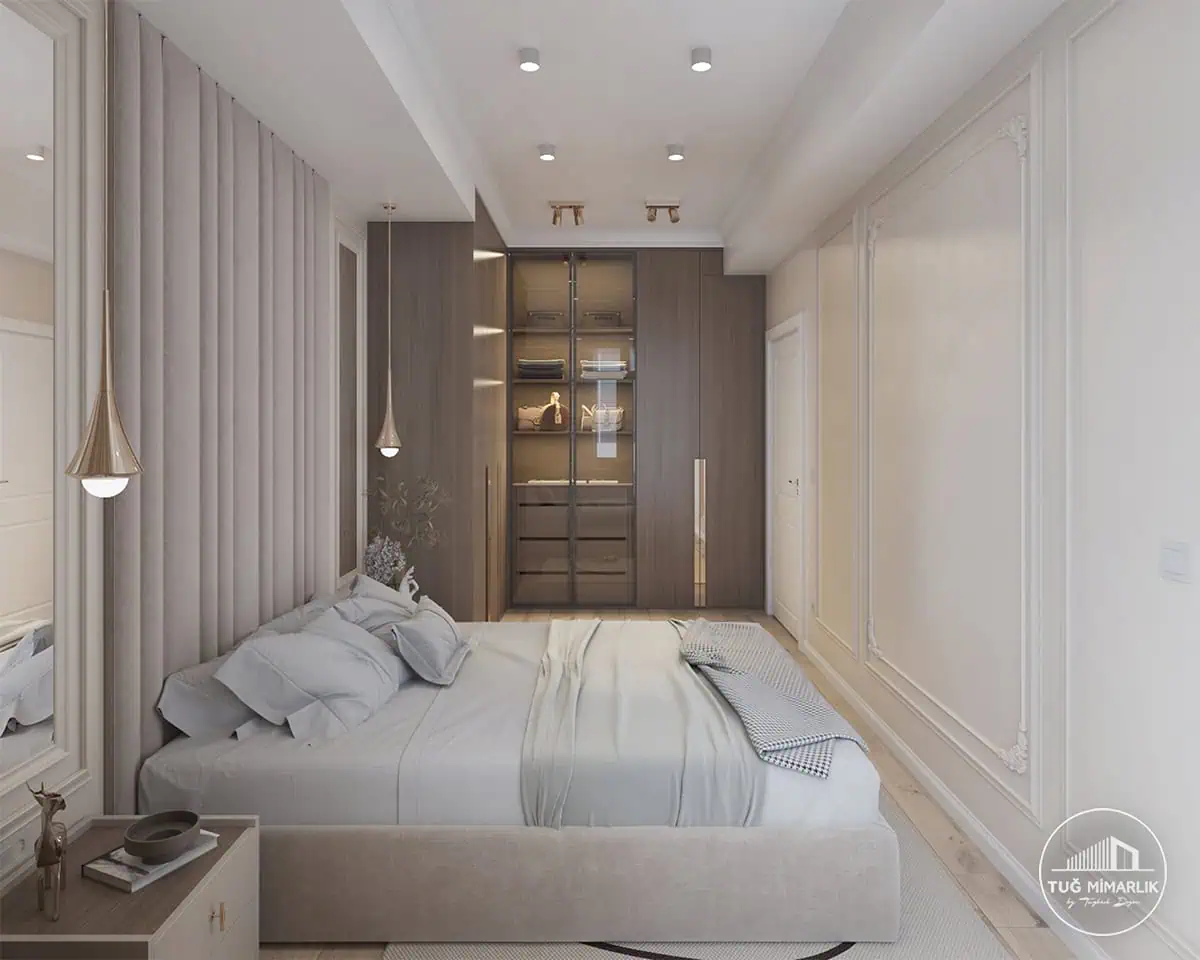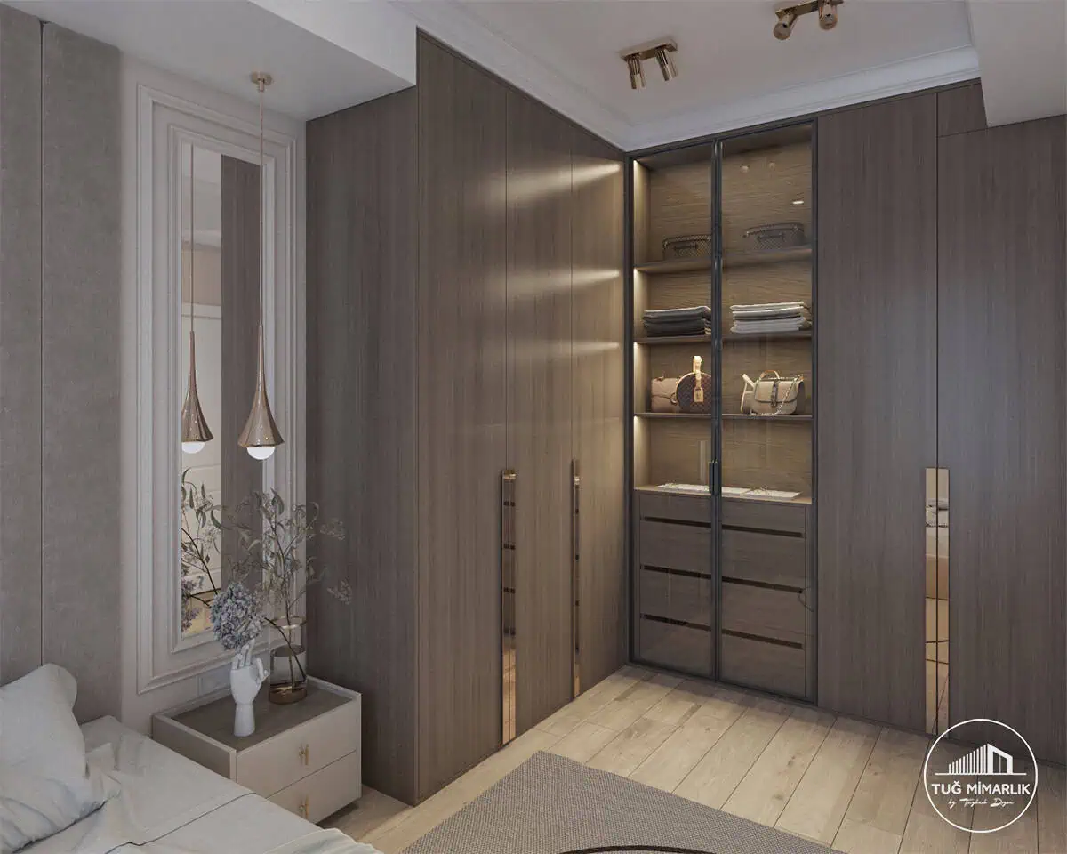 Cam kapaklı dolap, doğru yerde kullanıldığında odayı daha zengin gösterir. Bu projede cam kapaklı gardırop depolama alanını daha prestijli hale getirdi.