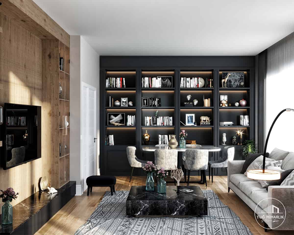 Bu Beykoz Salon Tasarımı, Mesa Orman’da ahşap TV duvarı, siyah kitaplık ve mermer orta sehpayı aynı çizgide buluşturur. Detayları görmek için Salon Projeleri sayfamıza göz atın.