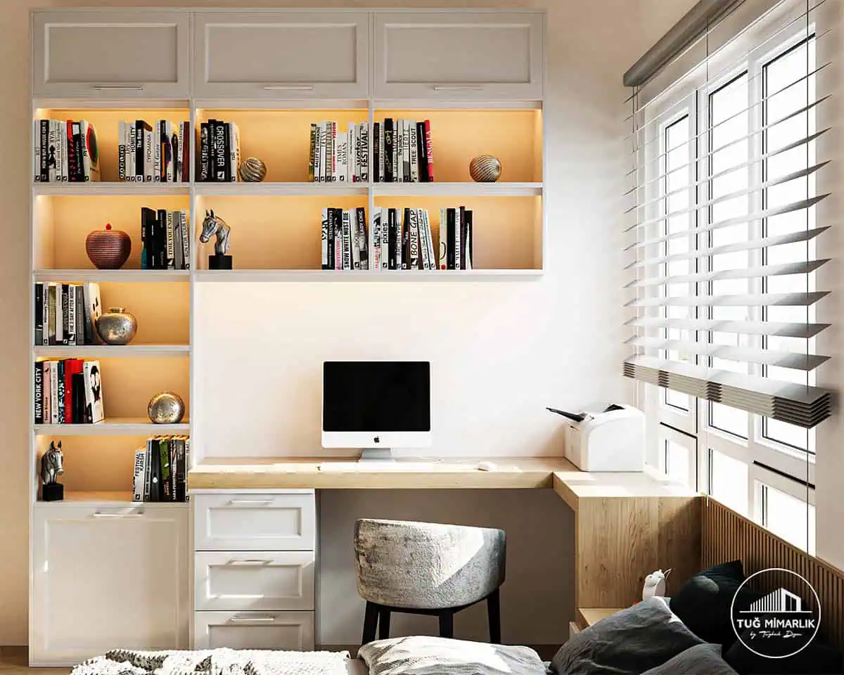 En verimli çözüm, masayı gün ışığı alan bir aksa yerleştirmektir; bu projede pencere yakını seçilerek uzun süreli kullanımda konfor artırıldı. Ergonomik masa ve depolama entegrasyonu için hizmetler sayfamızdan kapsamı görebilirsiniz.