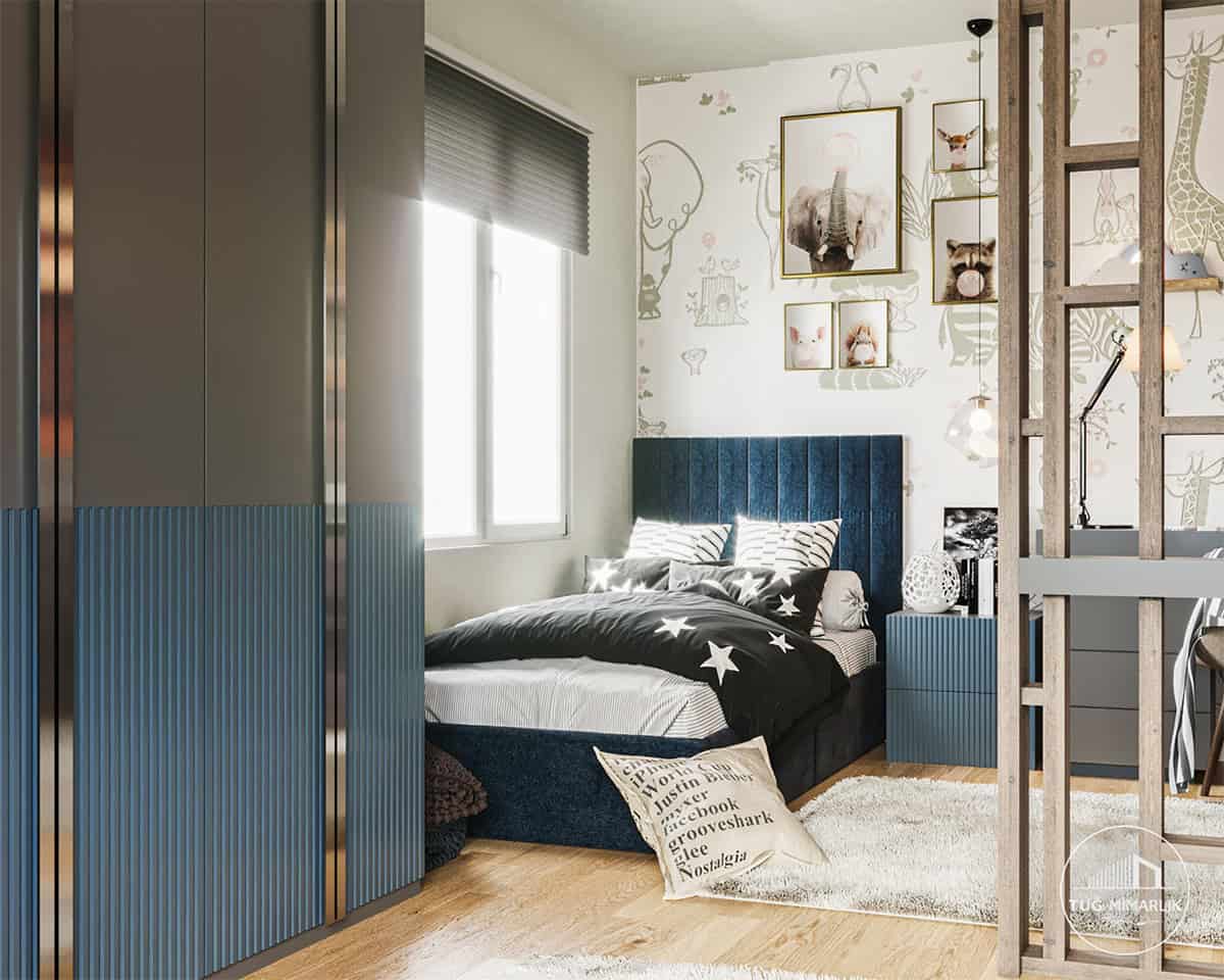 Bu erkek genç odası tasarımında iki çocuğun alanı, yarı açık raflı seperatörle bölünerek mahremiyet ve düzen sağlandı; çalışma, depolama ve uyku aksı netleştirildi.