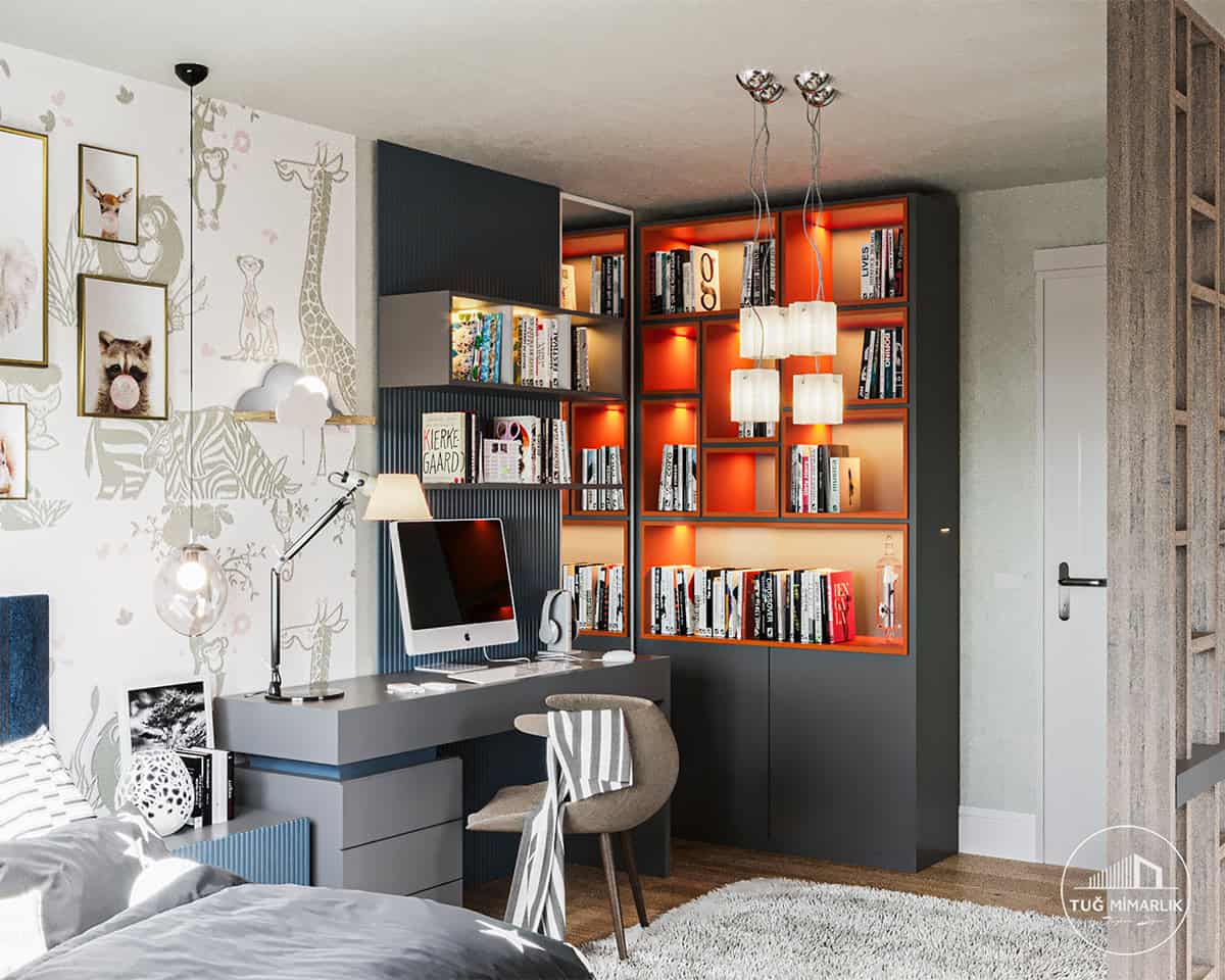 Mutluhan Konakları’nda tasarladığımız erkek genç odası, iki çocuğun aynı odada hem ders hem dinlenme düzenini koruyan, kişiye özel mobilyalı bir planlamadır. Benzer projeler için /projeler/genc-odasi-projeleri/ sayfamıza göz atabilirsiniz.