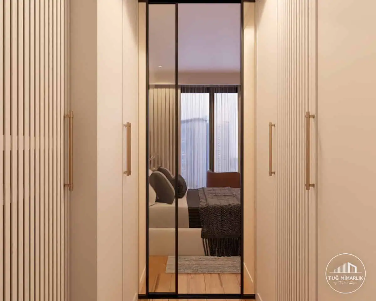 Bu projede ana hedef, genç odasının en büyük ihtiyacı olan özel dolap kapasitesini büyütürken alanı daraltmamak oldu. Koridor etkisi veren dolap dizilimiyle, iki yanda yüksek hacimli depolama oluşturduk; kapak yüzeylerinde dikey çizgili doku ve uzun kulplar kullanarak “tek parça” ve temiz bir görünüm yakaladık. İç yerleşimde askılık, katlama rafı ve çekmece oranları; yaş grubu ve kullanım alışkanlığına göre planlanır. Böylece “her şey sığsın” hedefi, pratik kullanımda da karşılığını bulur. Dolapların karşısında konumlanan cam bölme/sürgü hattı ise, hem mekânı daha geniş hissettirir hem de ışığın odanın derinliğine taşınmasına yardımcı olur. Bu tarz uygulamalarda ölçü ve imalat hassasiyeti kritik olduğu için, Tuğ Mimarlık’ta süreç; yerinde ölçüm, çizim onayı ve üretim detaylarıyla ilerler. Tasarım yaklaşımımızı ve ekibimizi tanımak için Hakkında sayfamızı inceleyebilirsiniz.