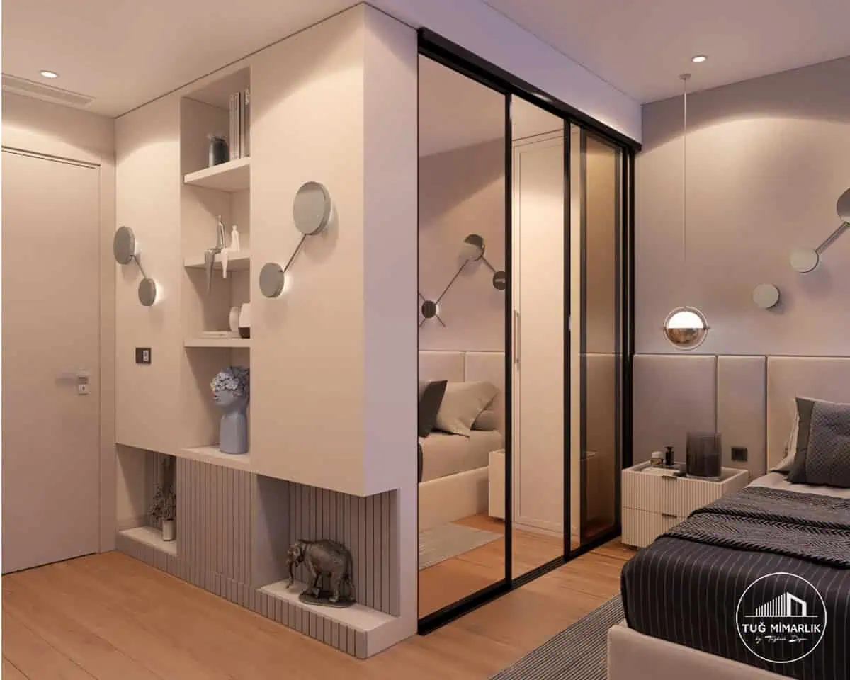 • Üsküdar genç odası tasarımı aynalı dolap, niş aydınlatma ve oturma pufu