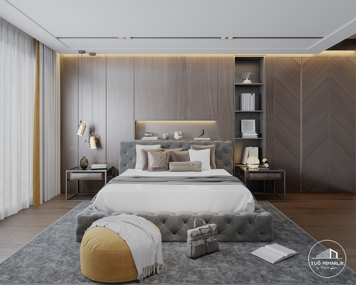 Başlık duvarı, yatak odasının ilk dikkat çeken bölümüdür ve mekânın kalite algısını doğrudan etkiler. Bu projede özel başlık duvarı ile odanın merkezinde daha güçlü bir görünüm elde edildi. Benzer uygulamalar için yatak odası projeleri sayfasına bakabilirsiniz.