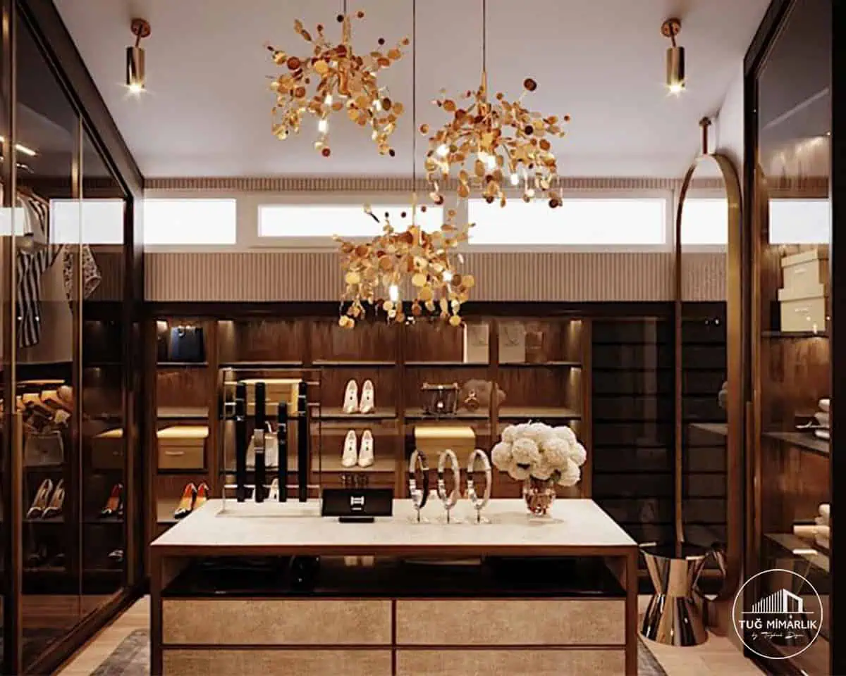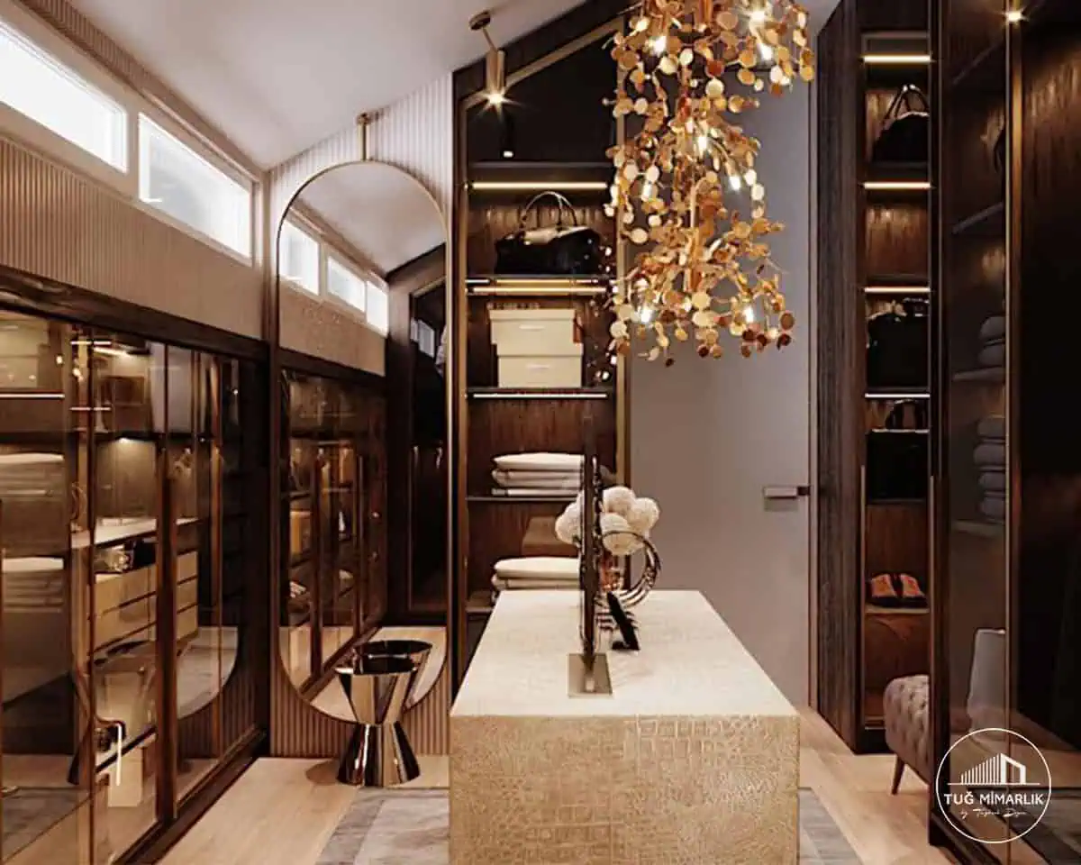Bu projede aydınlatma, yalnızca mekânı görünür kılan teknik bir unsur olarak bırakılmadı; giyinme odasının lüks algısını yükselten ana unsurlardan biri haline getirildi. Dolap içlerinde kullanılan sıcak ışıklar, cam yüzeylerdeki yansımalar ve tavandan sarkan dekoratif aydınlatmalar birlikte düşünüldü. Koyu ahşap kaplamalar ile açık renkli zemin ve ada yüzeyi arasında kurulan ilişki, mekânın daha güçlü görünmesini sağlıyor. Özellikle aksesuar, ayakkabı ve çanta sergilemesinin olduğu giyinme odalarında ışığın rengi ve yerleşimi çok önemlidir; yanlış çözümlerde dolap sistemi ağır ve kapalı görünür. Bu projede ise her bölüm daha canlı, daha zengin ve daha seçkin algılanıyor. Suadiye ve Kadıköy çevresinde üst segment konutlarda giyinme odası istenirken kullanıcılar yalnızca depolama değil, aynı zamanda kalite hissi veren bir iç mekân bekler. Bu bölüm SEO’da aydınlatmalı dolap sistemi, Kadıköy giyinme odası tasarımı ve lüks giyinme odası kelimelerini destekler. Firma yaklaşımımız için hakkimizda sayfasını ziyaret edebilirsiniz.