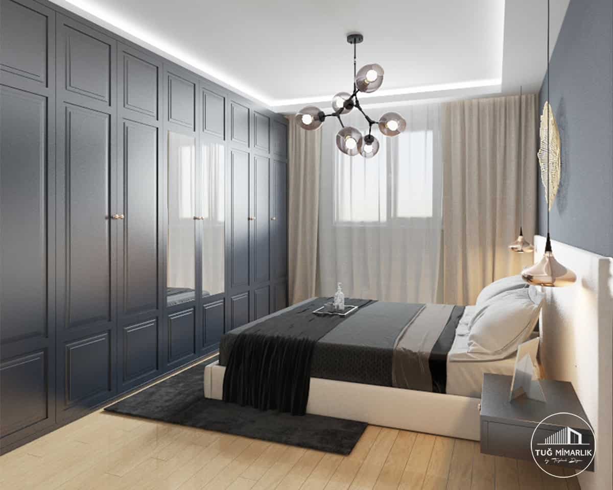 Bu projede gri, antrasit, açık bej ve sıcak metal detaylar dengeli biçimde bir araya getirildi. Başlık duvarında kullanılan düz yüzey, odanın daha sakin görünmesine destek verirken, gardırop yüzeylerindeki çerçeveli kapak tasarımı mekâna daha güçlü bir karakter kattı. Yumuşak tekstiller ve açık zemin rengi, koyu gardırop tonunun odayı ağırlaştırmasını önledi. Bu sayede oda sert değil, daha seçkin ve daha zamansız bir görünüm kazandı. Özellikle Suadiye modern yatak odası ve Kadıköy yatak odası dekorasyonu arayan kullanıcılar için bu proje güçlü bir referans oluşturur. Marka yaklaşımımızı ve proje anlayışımızı incelemek için hakkımızda sayfası ziyaret edilebilir. Her yüzeyin amacı, odayı daha pahalı ve daha düzenli göstermektir.