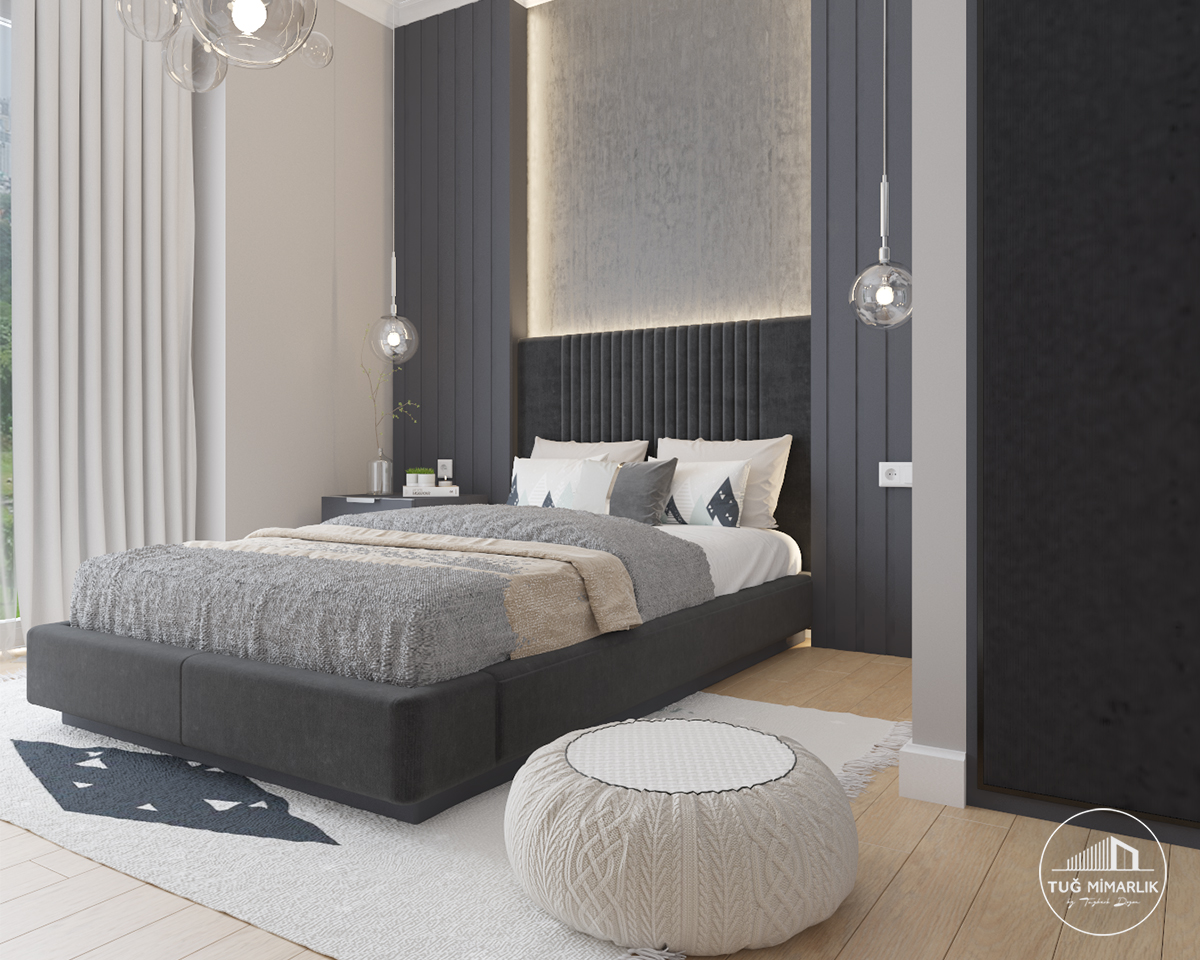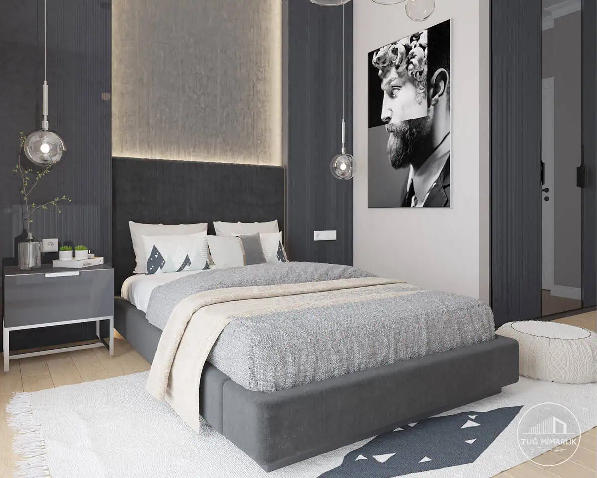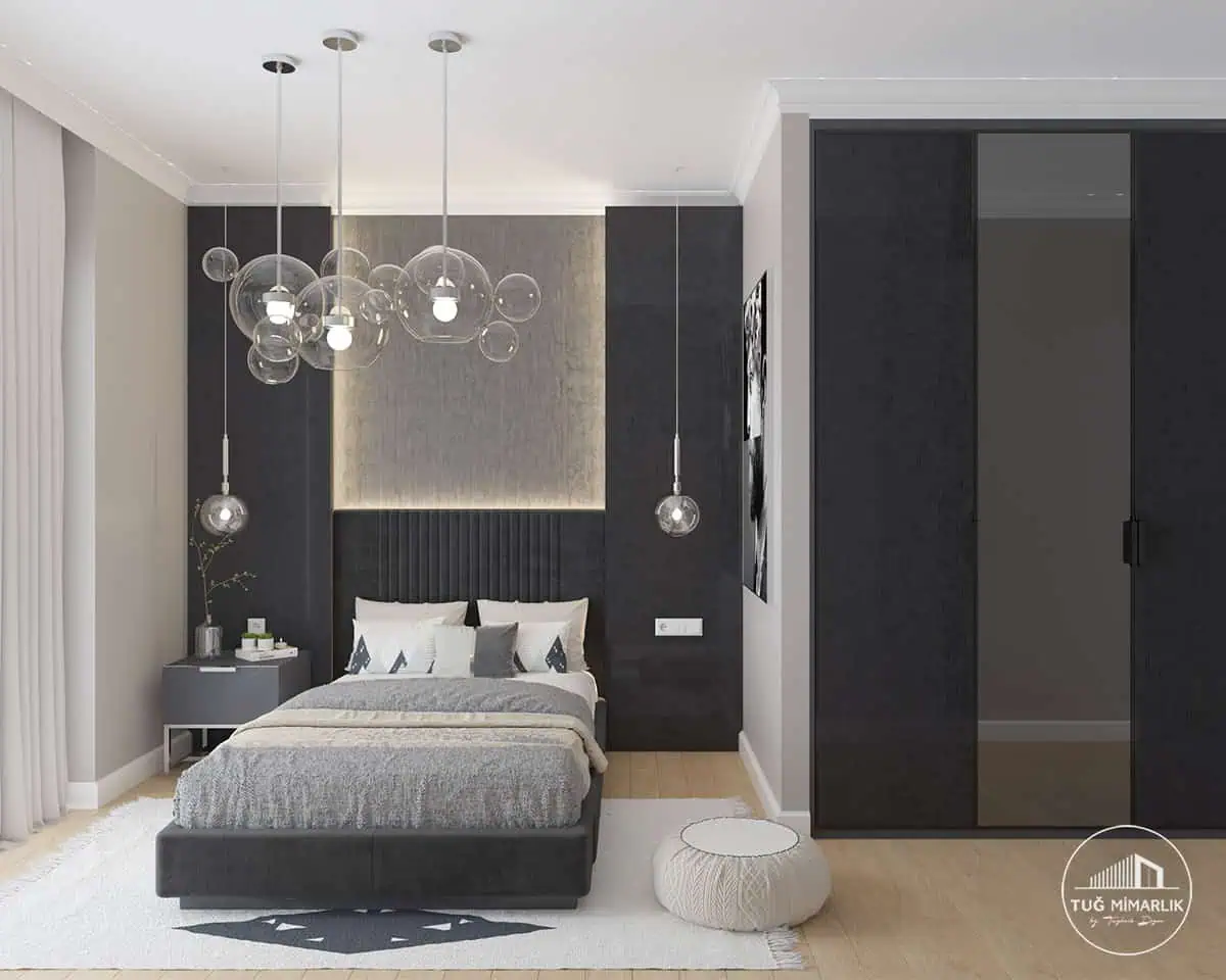 Bu Tuzla Giyinme Dolaplı Genç Odası projesinde yüksek depolama ihtiyacı, koyu yüzeyler ve yumuşak tekstiller bir araya getirilerek daha düzenli, daha güçlü ve günlük kullanımı rahat bir oda planlandı.