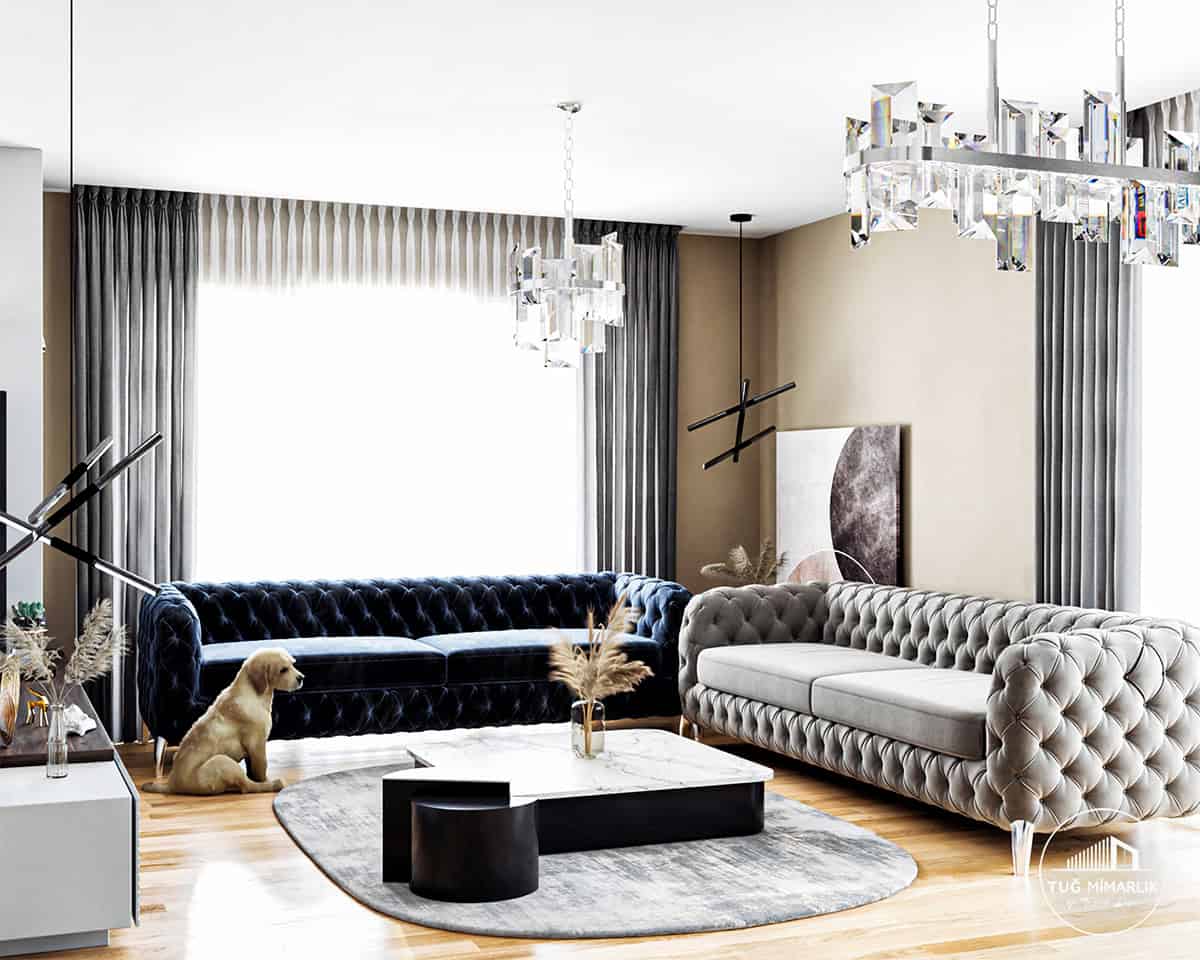 • Büyükhanlı Residence salon tasarımı geniş açı oturma alanı ve perdeler