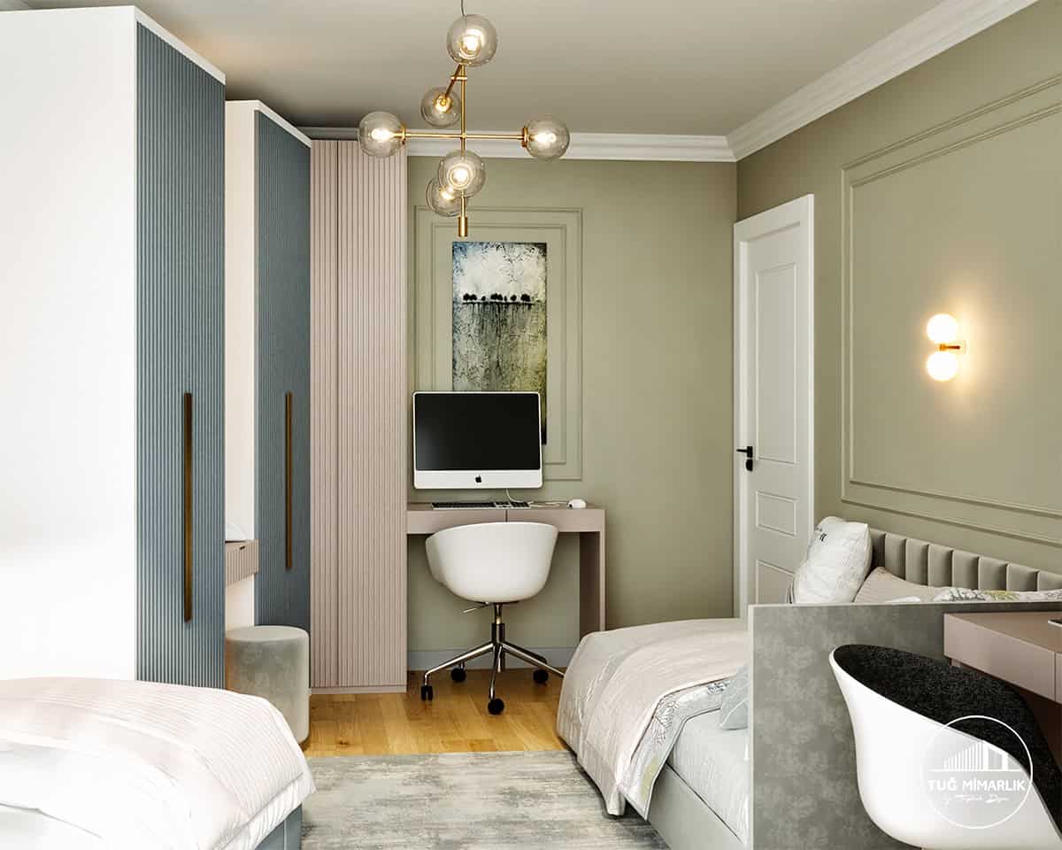 Bu sayfadaki genç odası, iki yatak ve çalışma alanını aynı odada toparlamak isteyen aileler için iyi bir örnektir. Süreç ve mobilya kapsamı, evin ölçülerine göre netleştirilir.