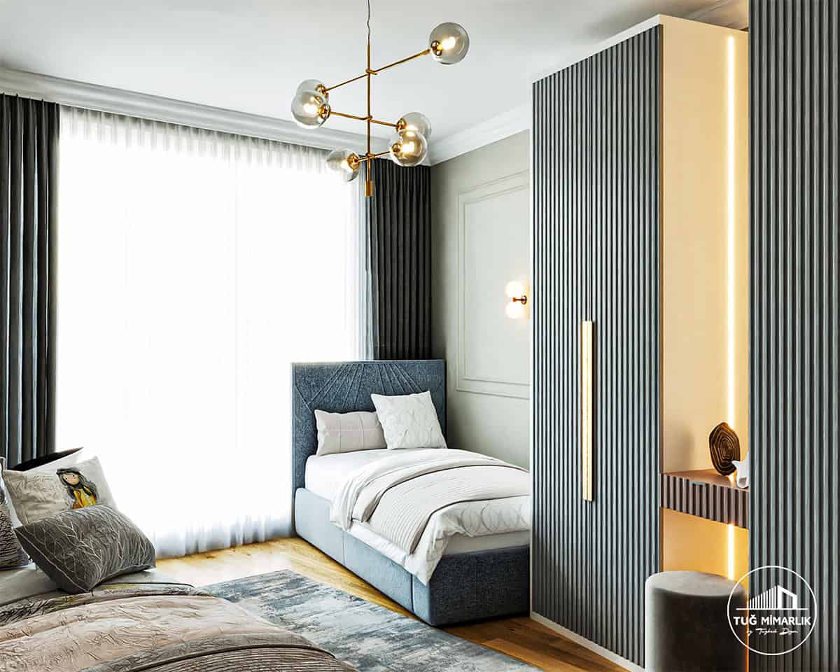 Bu odada hedef, iki yataklı kullanımın kalabalık görünmeden rahat kalmasıydı. Yatak konumları ve geçiş mesafeleri, gün içinde hızlı toplanan bir düzeni destekleyecek şekilde ele alındı. Başlık tarafındaki yalın duvar panelleri ve sıcak aydınlatma, odanın “çocuk odası” hissine sıkışmadan daha olgun bir çizgide kalmasını sağlıyor. Yatak tekstilleri ve halı seçimiyle tonlar sakin tutulurken, tavandaki cam küre aydınlatma ile mekâna karakter eklendi. iki yataklı genç odası arayanlar için bu tip çözüm, hem kardeş kullanımı hem de misafir yatak alternatifi olarak pratik sonuç verir. Uygulama kapsamımızı görmek için hizmetler sayfasına geçebilirsiniz.