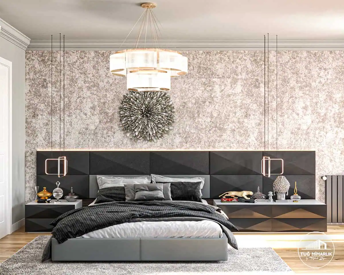 Yatak başlığında geometrik yüzeyler ve yumuşak tonlar birlikte kullanılarak daha “olgun” bir atmosfer oluşturuldu. Duvarın genelinde kullanılan dokulu yüzey, ışık vurduğunda derinlik veriyor; başlıkta ise modüler panellerle daha temiz bir görünüm hedefleniyor. Komodin/şifonyer hattında devam eden formlar, oda içinde aynı tasarım çizgisini koruyor. Sarkıt aydınlatmalarda cam yüzeyin yansımasını rahatsız etmeyecek yükseklik seçimi önemli; bu yüzden aydınlatma kotu, yatak ve komodin ölçüsüyle birlikte düşünülüyor. Bu projede 18 m² ölçekte bile yatak başlığı tasarımı doğru çözüldüğünde, oda daha geniş algılanabiliyor. Detaylı planlama ve uygulama için iletişim sayfasından talebinizi iletebilirsiniz.