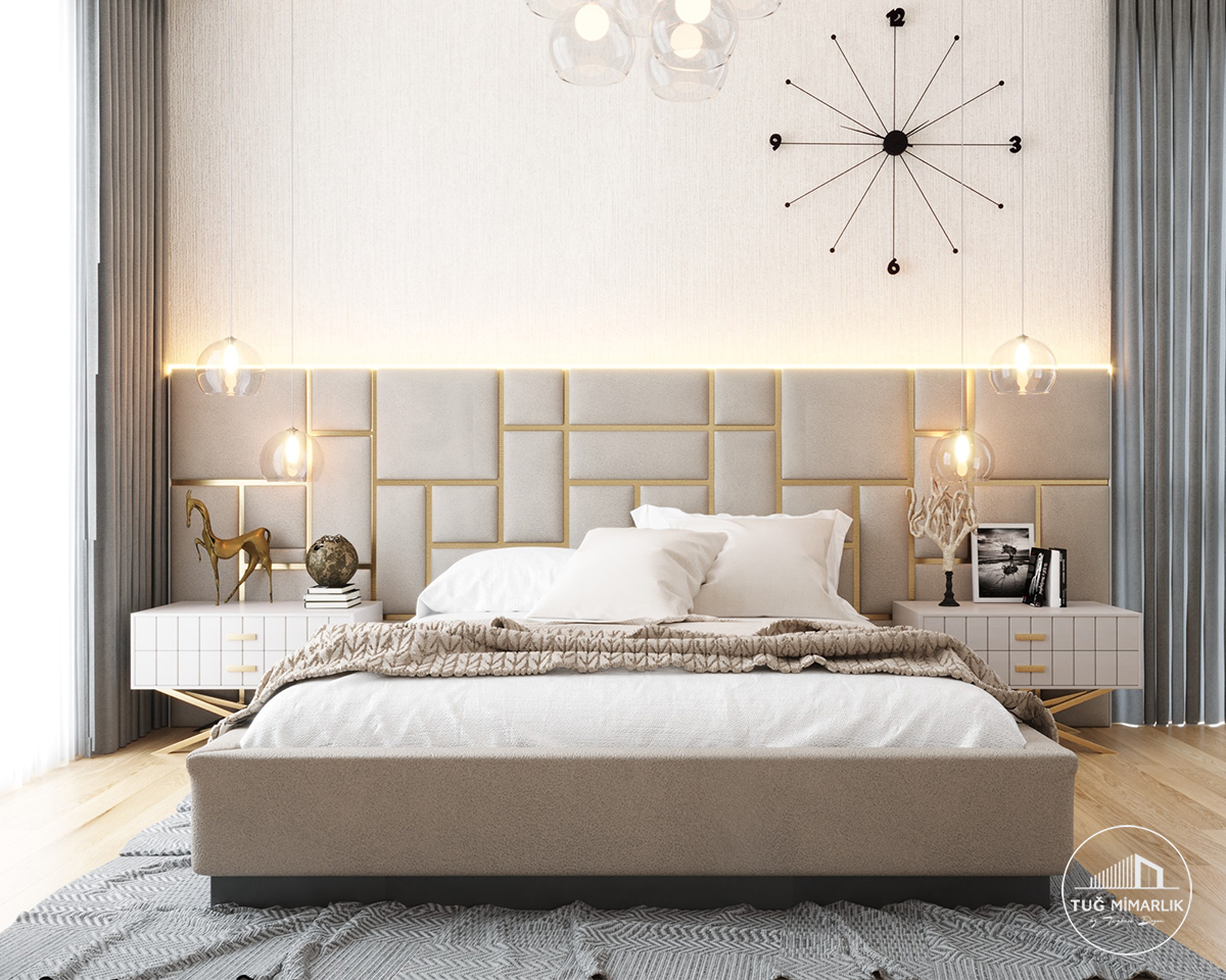 Başlık duvarı yatağın bulunduğu alanı güçlendirir ve odaya daha nitelikli bir görünüm kazandırır. Bu projede kullanılan özel başlık duvarı mekânın en belirleyici parçasıdır.