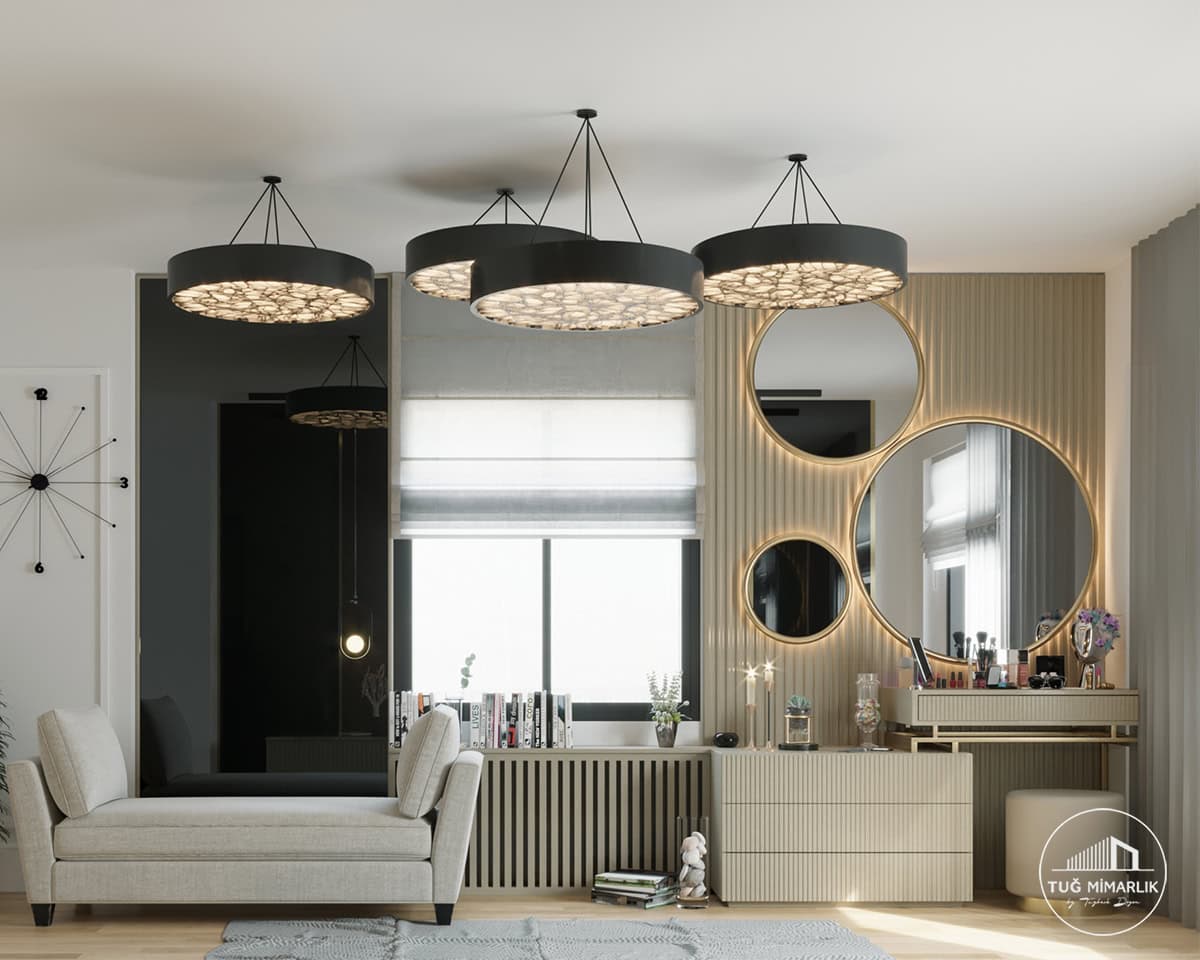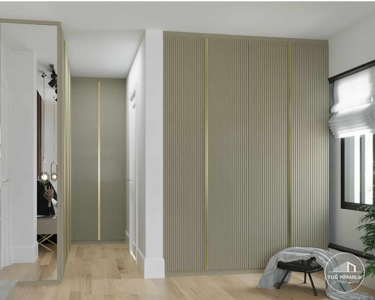 Yatak odası tasarımları odağında, Mutluhan Konakları Ömerli’deki bu 29m2 yatak odasında; güçlü bir yatak başı duvarı, oval aynalı konsol ve sensör aydınlatmalı giyinme alanı ile prestijli bir bütün kurduk.